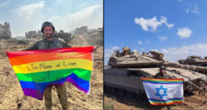 Israelske soldater flyr prideflagget over Gazas ruiner