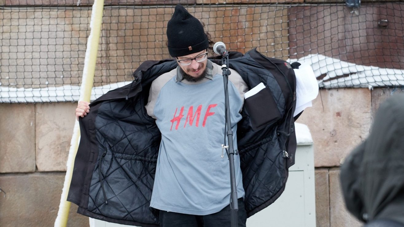 Kunstneren Dan Park taler på Mynttorget 2019. Foto: Nordfront.se.