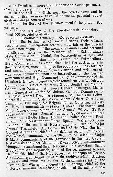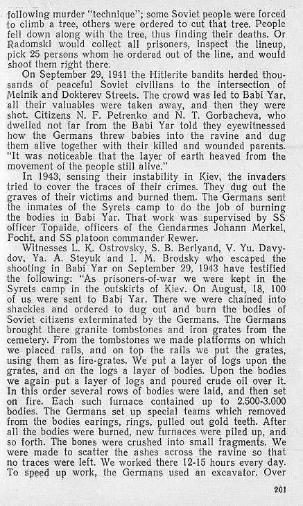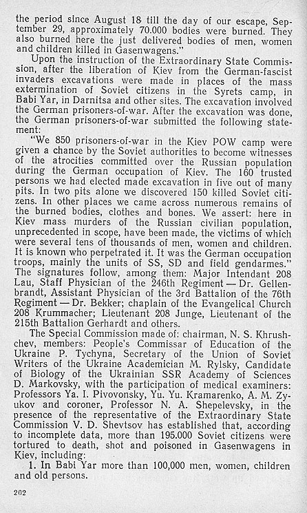 Rapporten hevder deretter at en «Spesialkommisjon» «har fastslått at, ifølge ufullstendige data, ble mer enn 195 000 sovjetiske borgere torturert til døde, skutt og forgiftet i gassvogner i Kiev, inkludert: