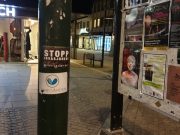 Rede 2 har nylig hengt opp klistremerker i Kristiansand sentrum.
