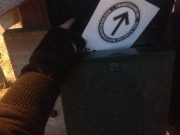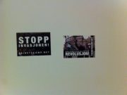 Aktivist fra Kampgruppe 301 har nylig hengt opp klistremerker i Straume på øya Litlesotra i Fjell kommune.
