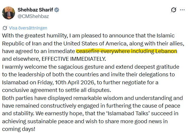 Irans president Masoud Pezeshkian skriver samtidig at «det sionistiske regimets fornyede aggresjon mot Libanon utgjør et åpenbart brudd på den opprinnelige våpenhvilen». Ifølge presidenten signaliserer USA og Israel «svik og manglende etterlevelse», noe som «gjør forhandlingene meningsløse».