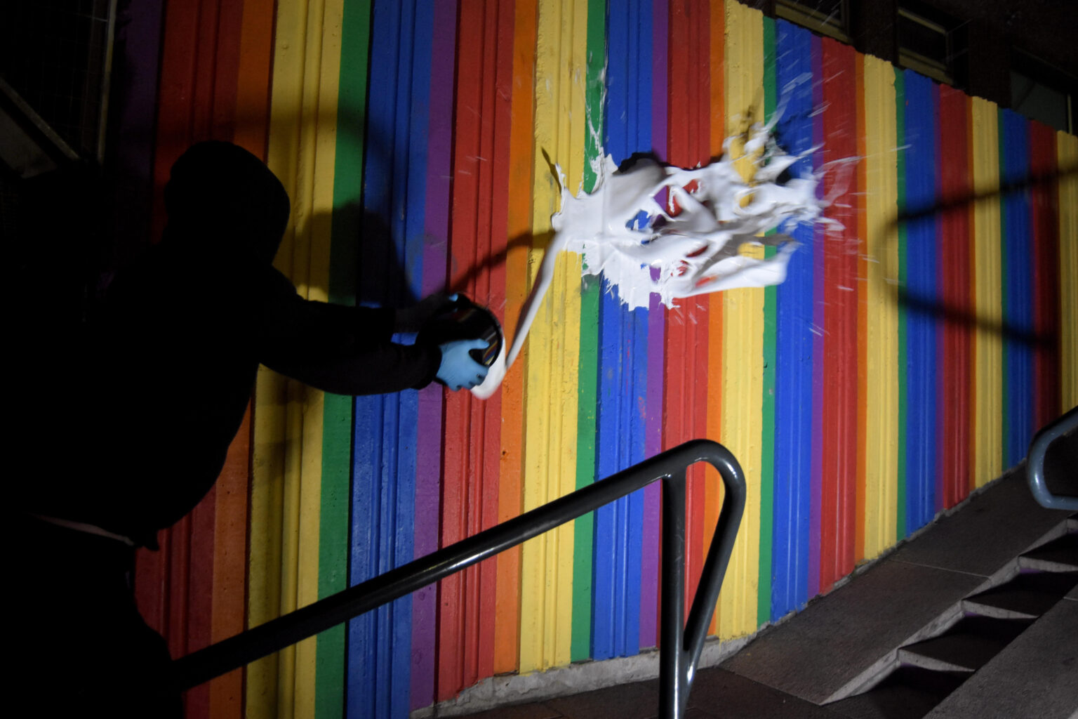 Trappens globalistiske uttrykk ble ødelagt da hvit maling ble hellet over regnbuefargene. I tillegg ble den også dekorert med spray med budskapet Stolt hvit ungdom.