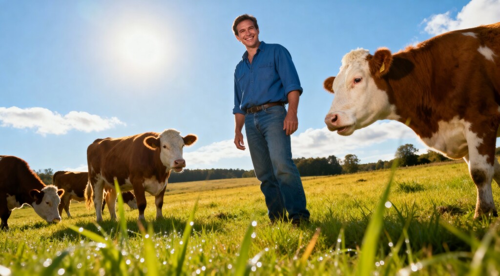 En glad bonde med fornøyde kuer. Foto: KI-generert.