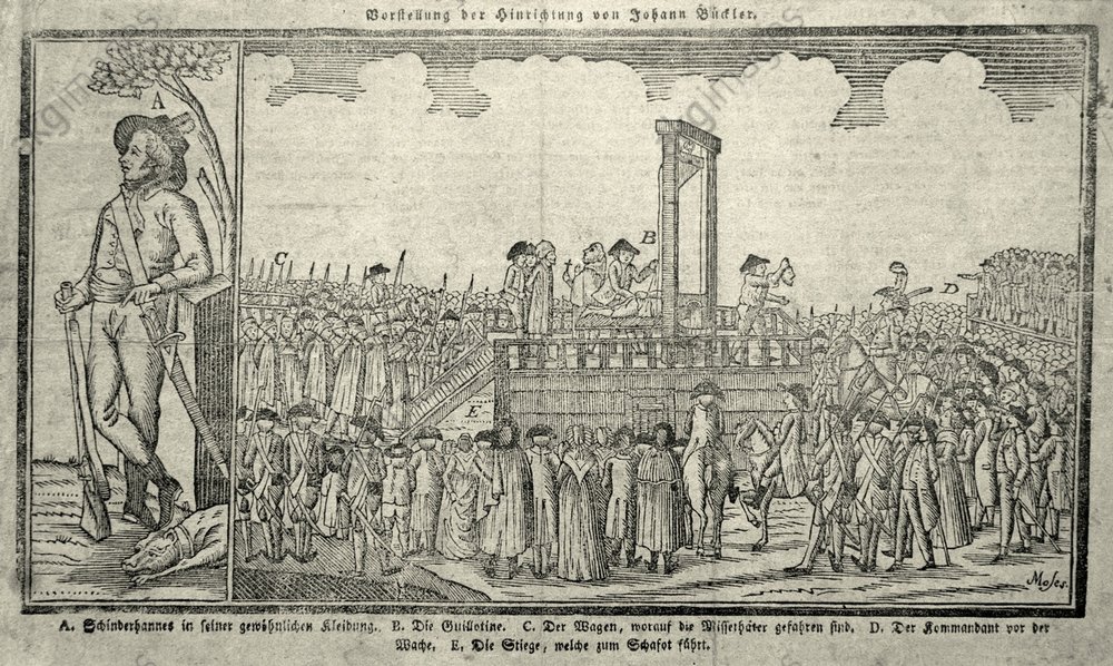 Den 21. november 1803 ble Johannes Bückler, bedre kjent som Schinderhannes, til slutt henrettet med giljotin innenfor Mainz’ porter. 40 000 tilskuere bevitnet prosessen.