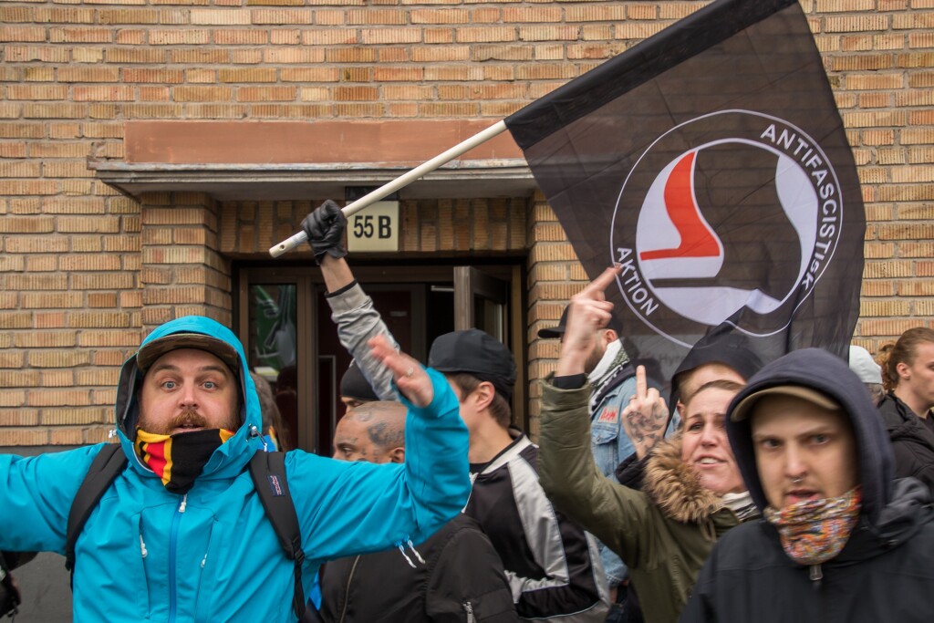 Venstreekstremister med antifascistiske symboler forsøker å forstyrre en 1. mai-demonstrasjon for nordiske arbeidere i Boden i 2018.