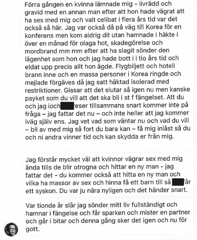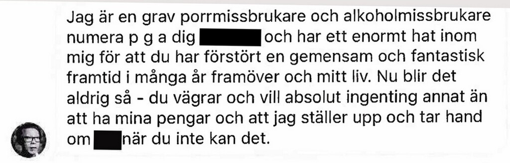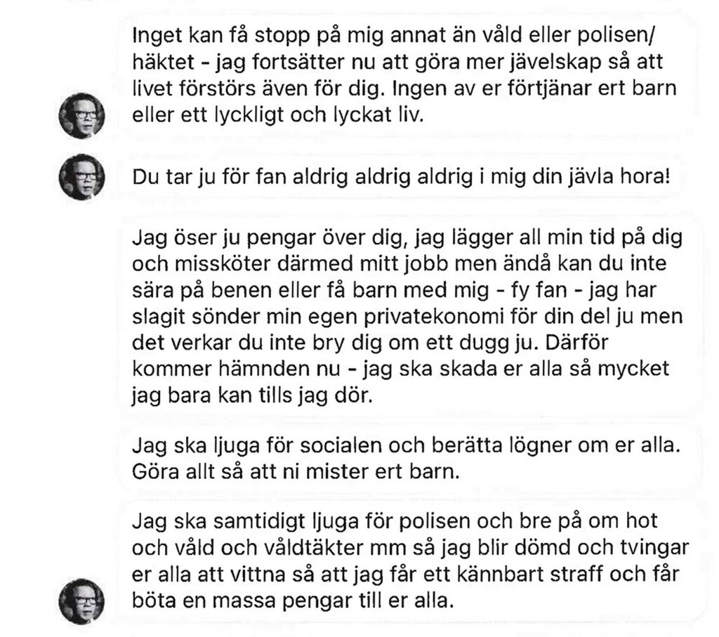 Hübinette mistet kontrollen mot slutten av sommeren i fjor og skrev en rekke aggressive meldinger til homsefedrene, men problemet synes å være minst ett år gammelt. Han anklaget dem bittert for at Arbouz ikke ønsker flere barn nå, og at han kommer til å dø barnløs. Han skriver også at han har forsøkt å voldta henne «minst 80 ganger», truer med å ødelegge livet deres og med å ta sitt eget liv. Det fremgår dessuten at hans rolle i regnbuefamilien har en økonomisk og tjenesteorientert karakter.